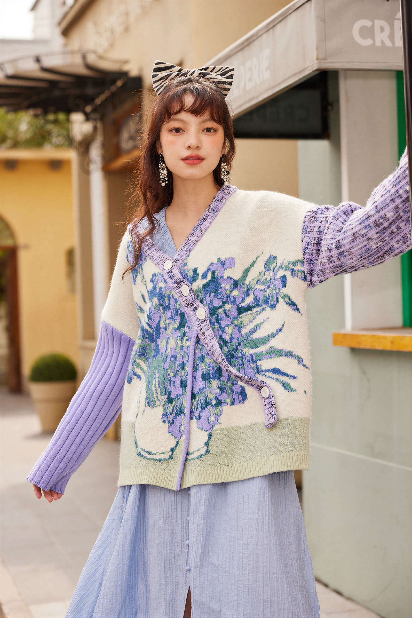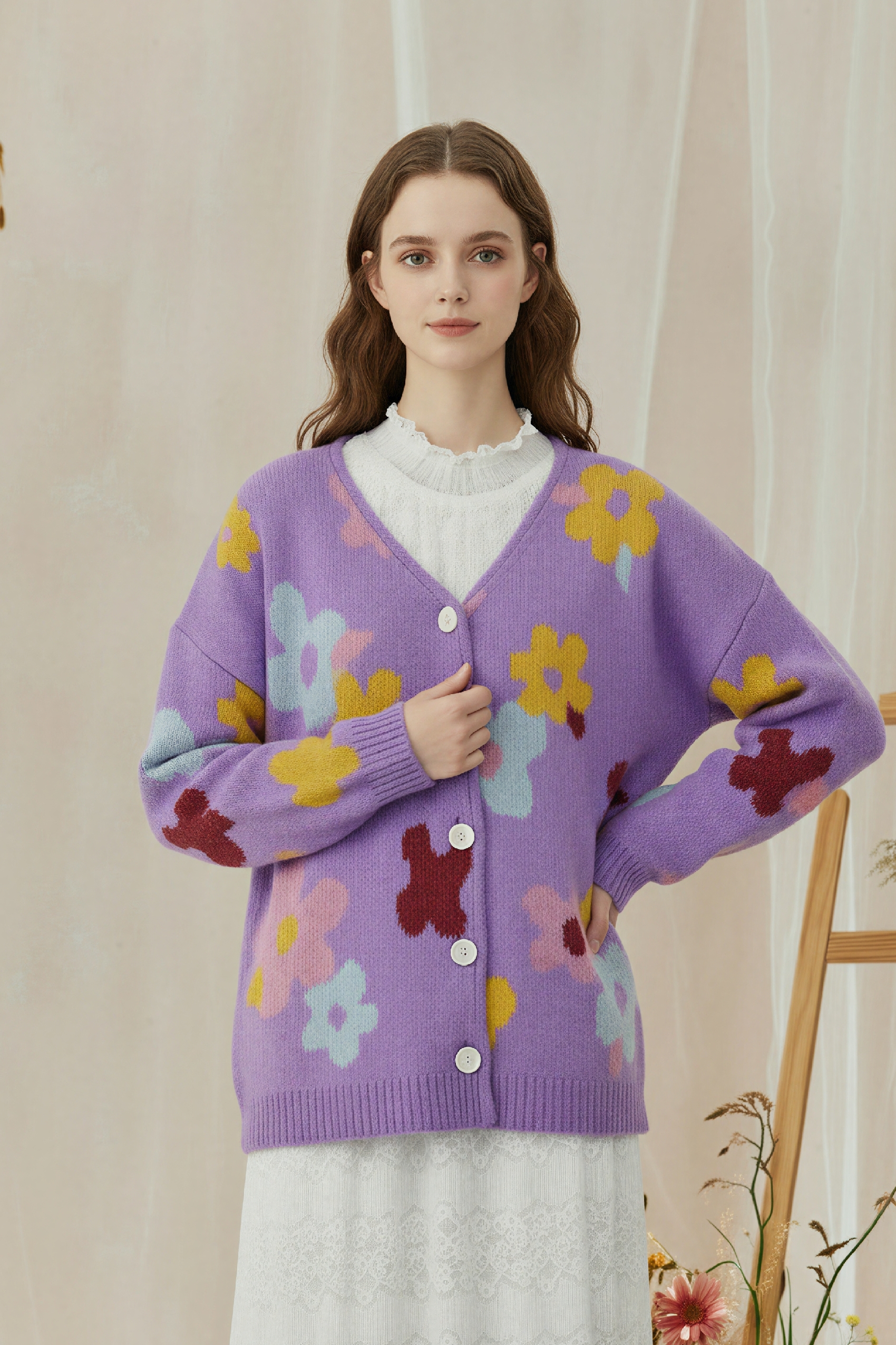 Monet-Inspired Floral V-Neck Relaxed Knit Cardigan