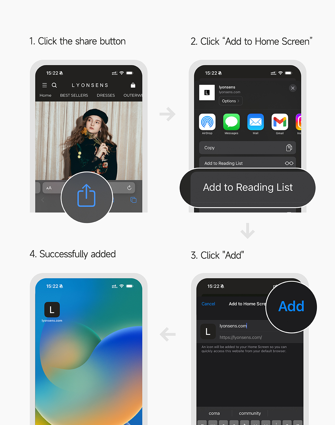 4. Successfully added LYONSENS has been successfully added to the homescreen! You can quickly access LYONSENS from yourdefault browser.