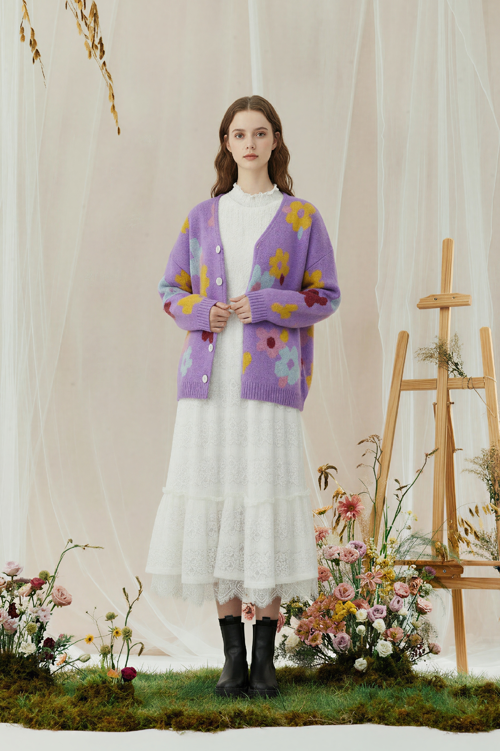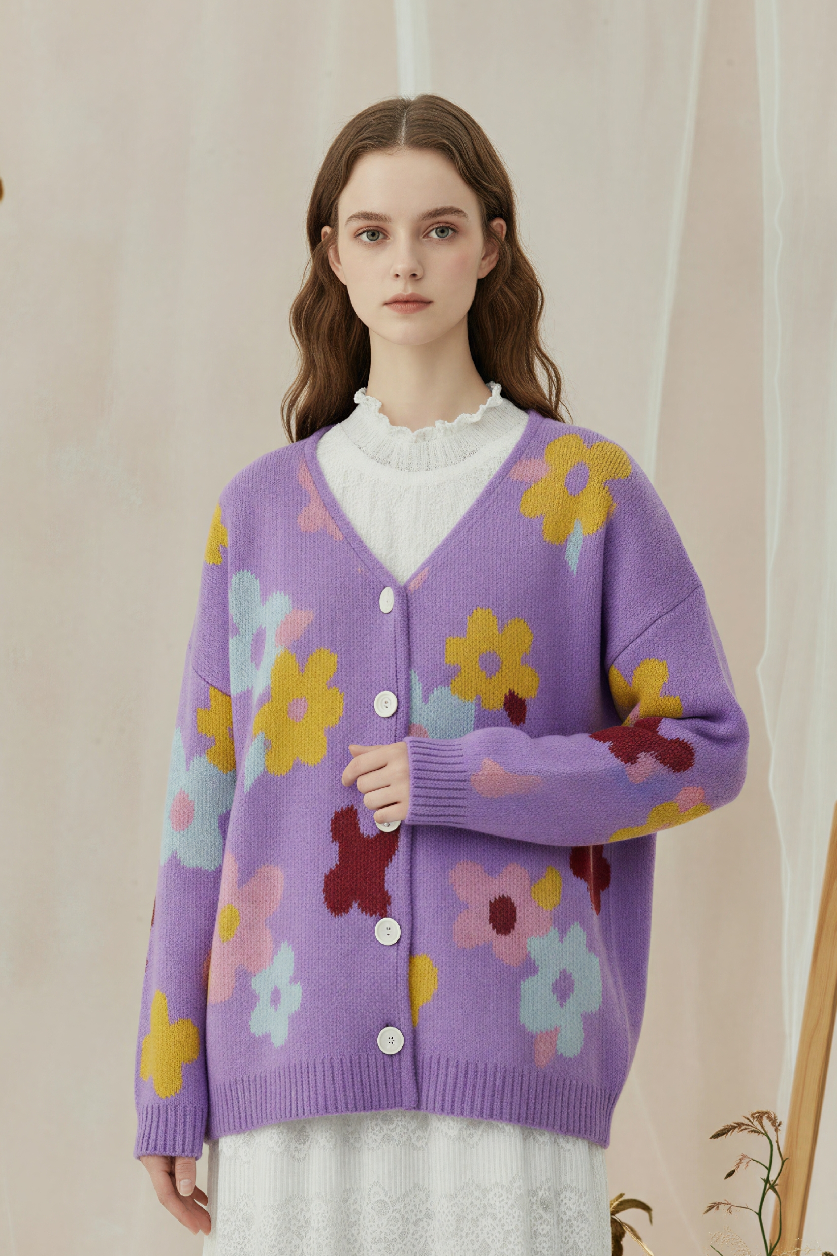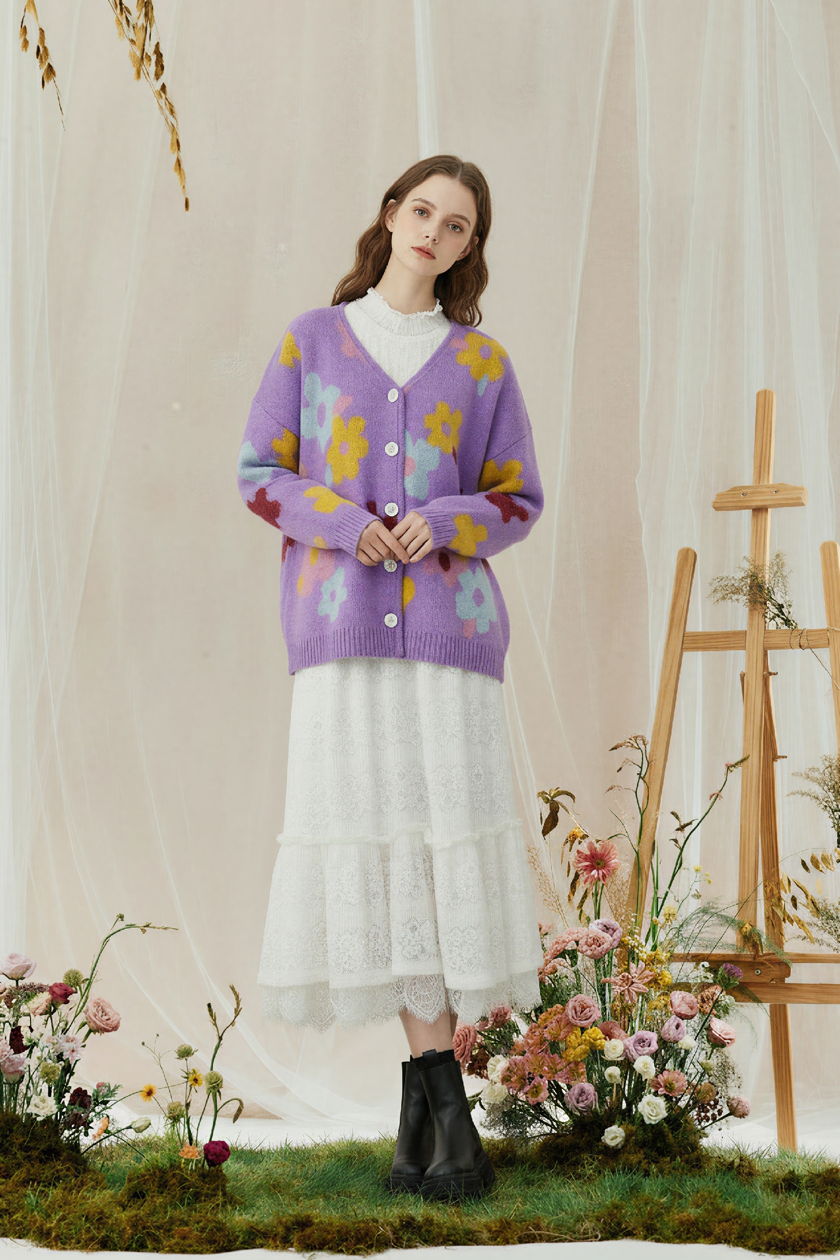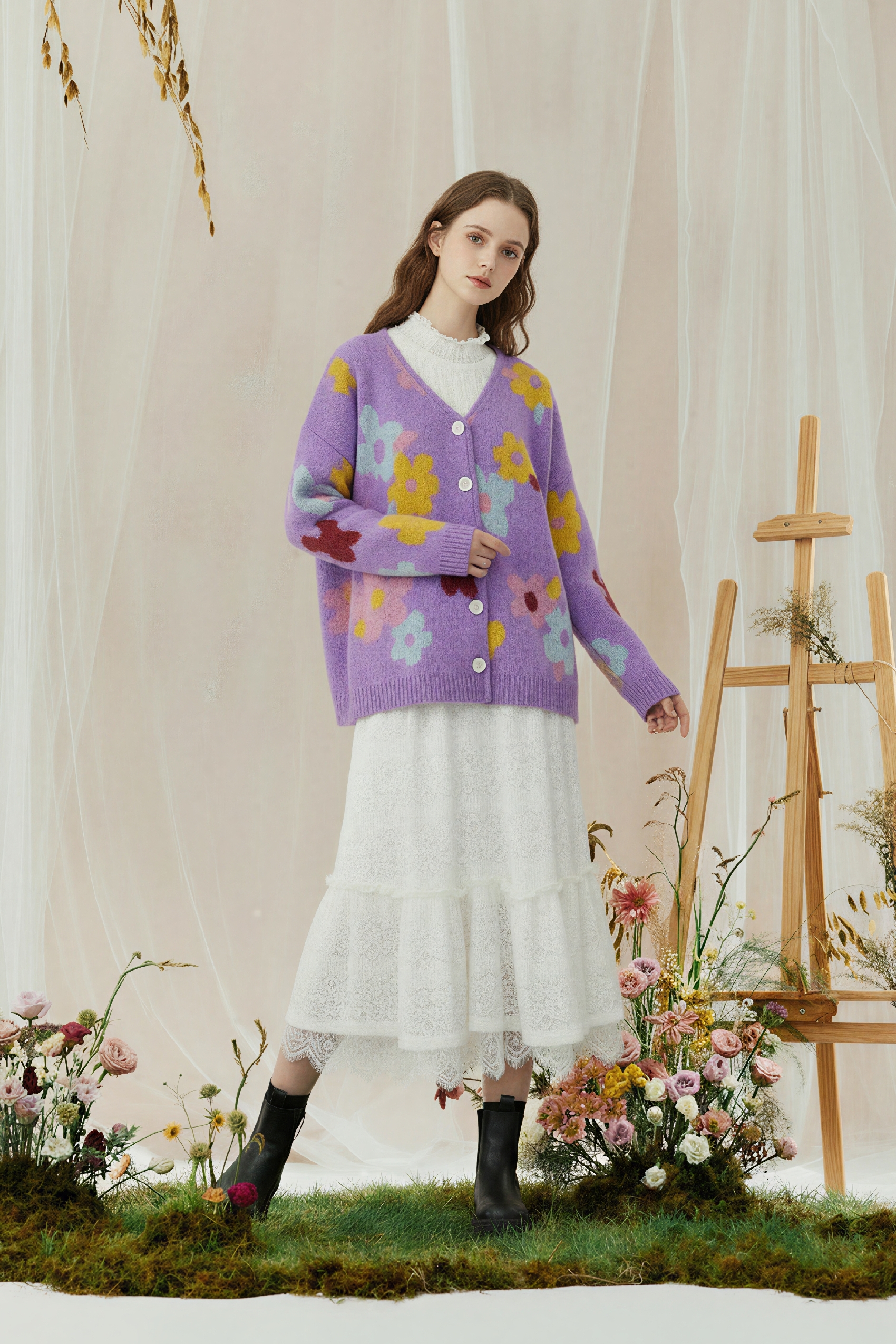Monet-Inspired Floral V-Neck Relaxed Knit Cardigan