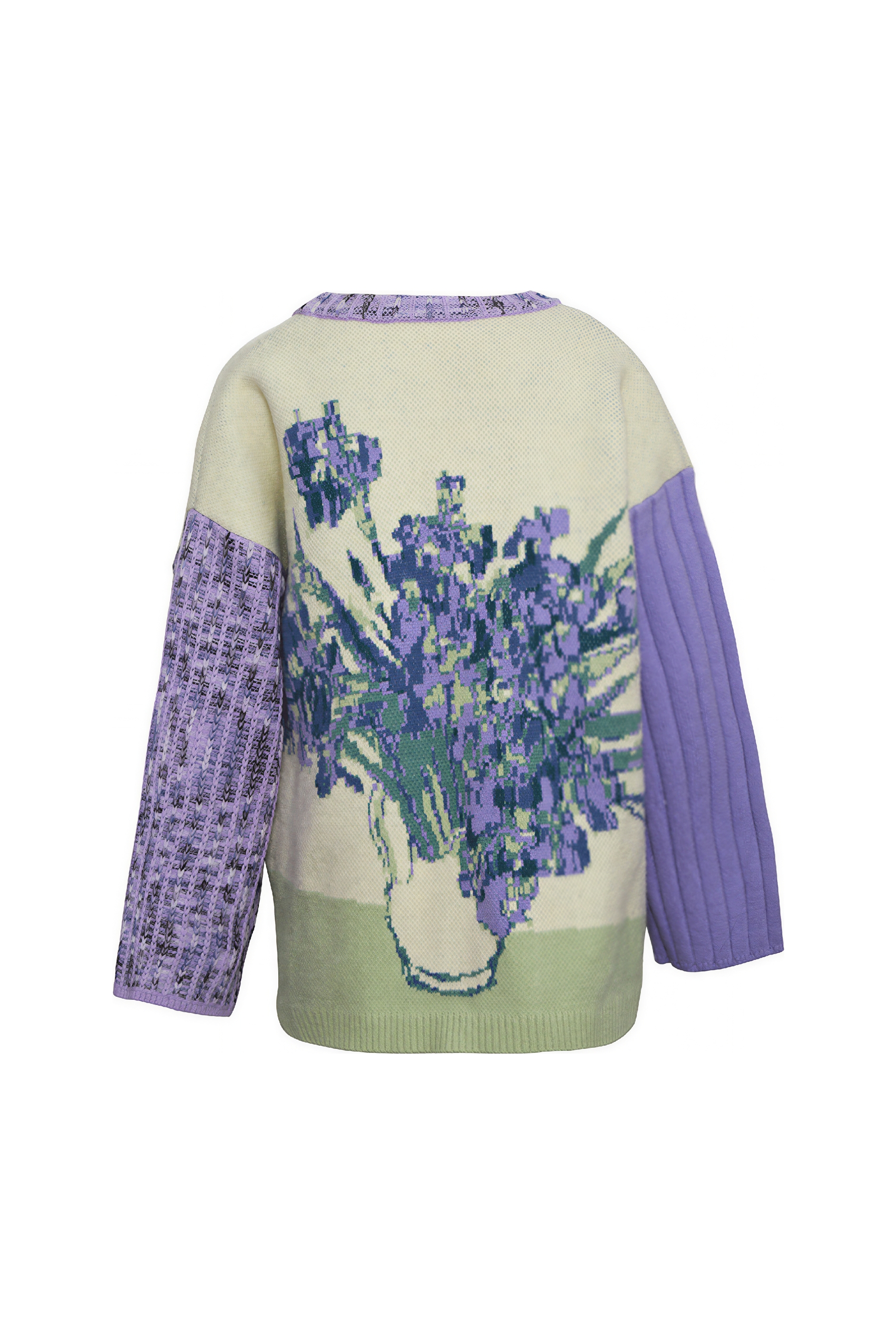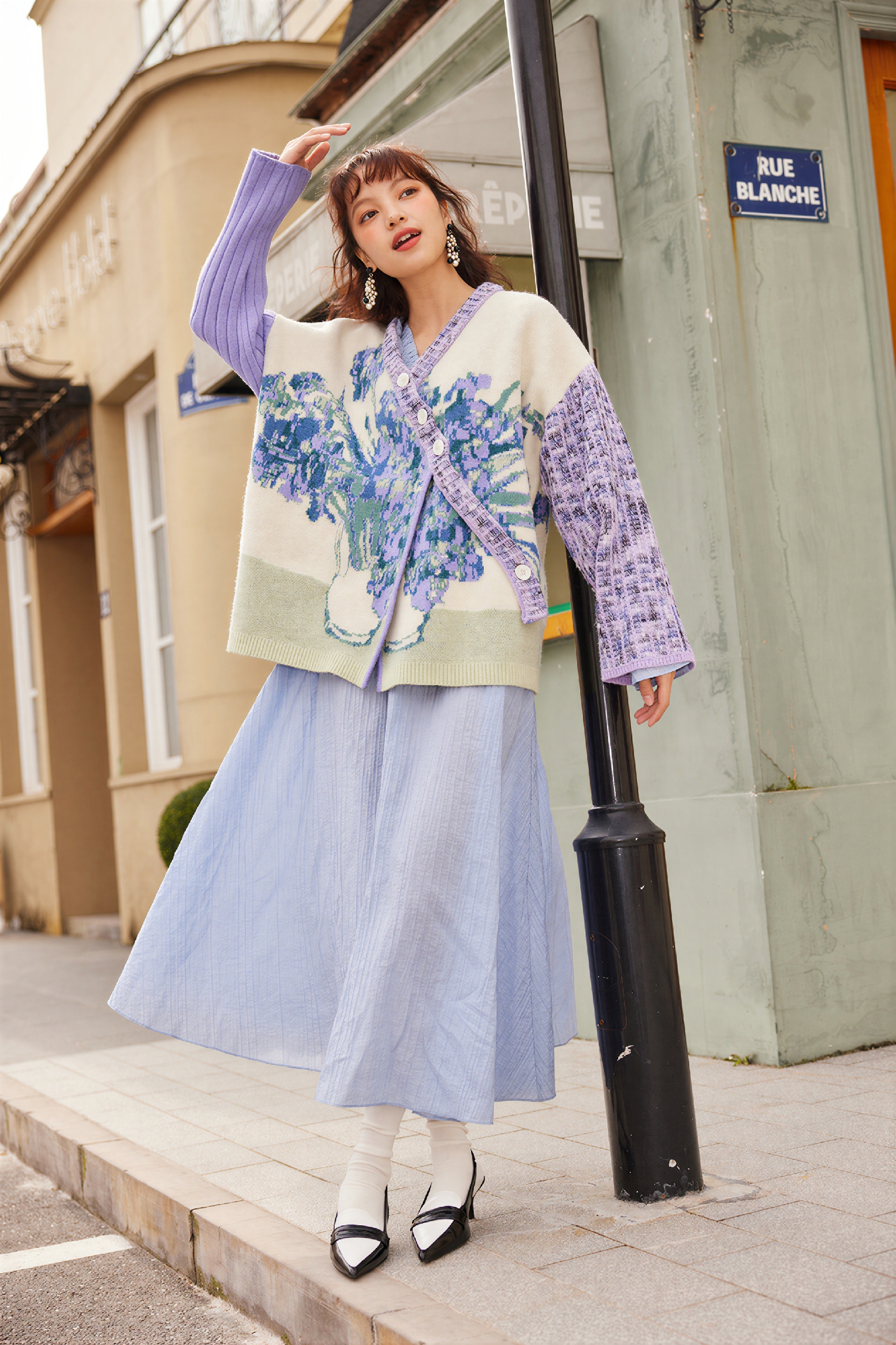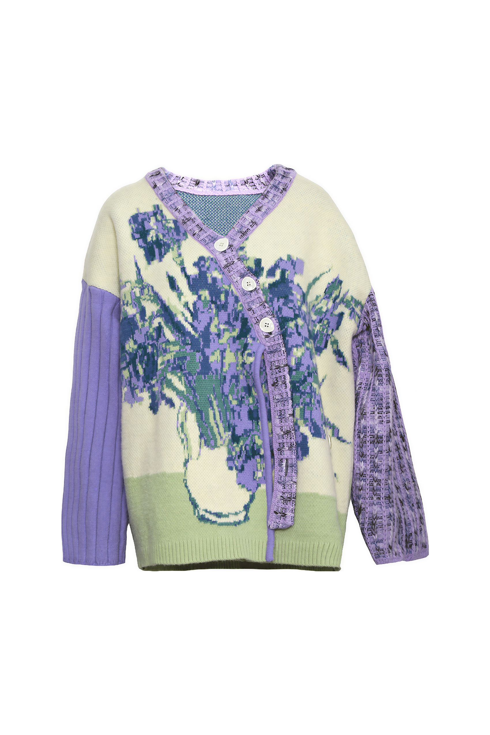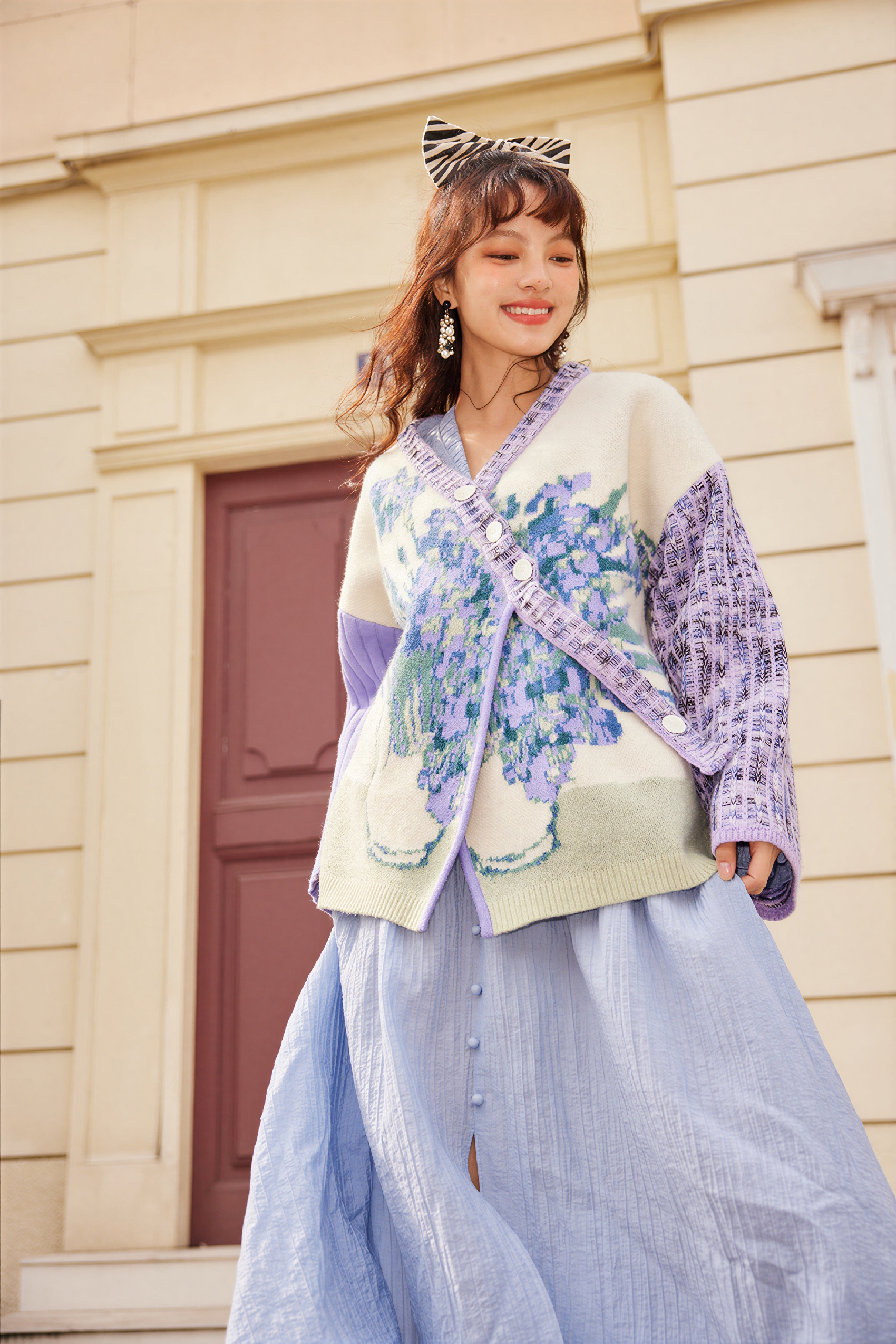Van Gogh-Inspired Purple V-Neck Knit Cardigan